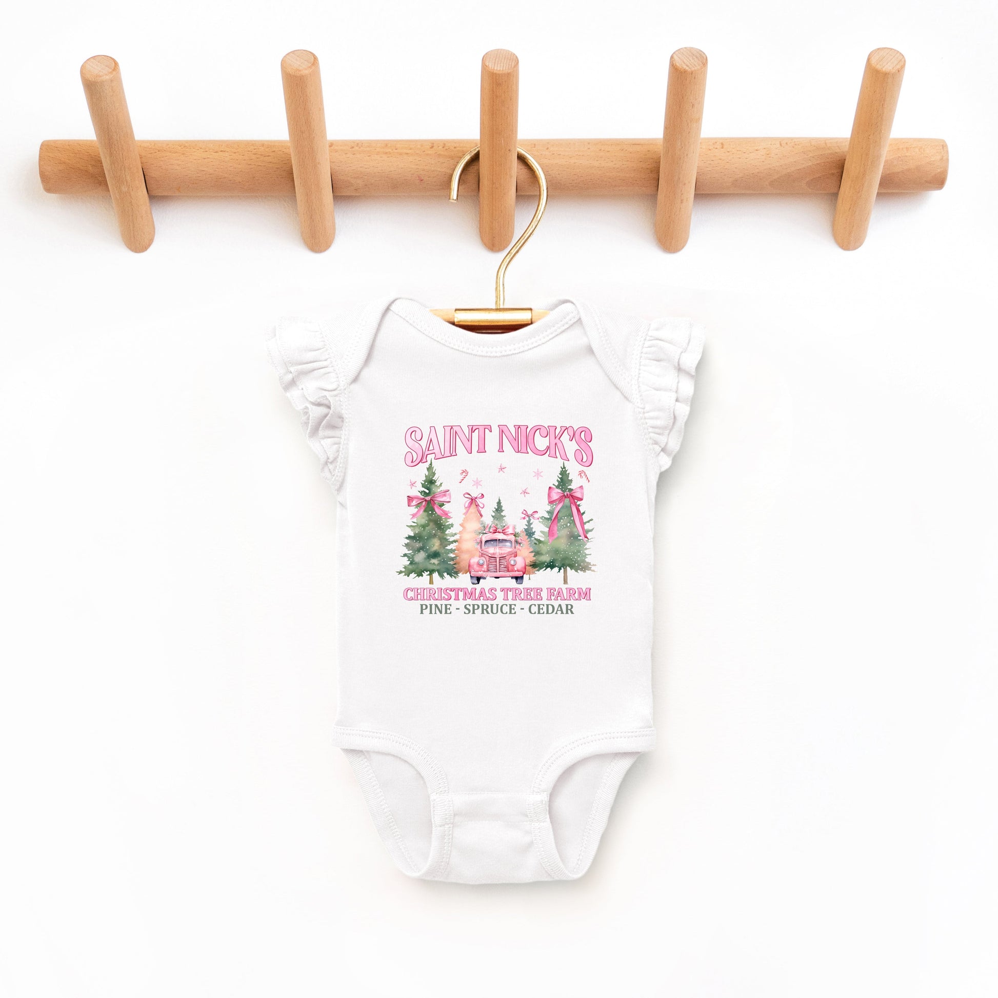 Coquette St. Nick's Tree Farm | Baby Graphic Flutter Sleeve Onesie
