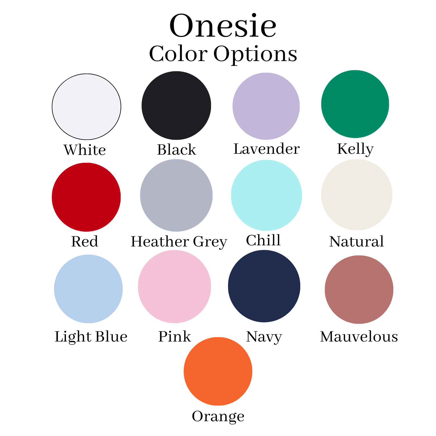 *If you would like the design printed on a different color onesie, we have many more options to choose from (see color chart). Send us a message and we’ll be happy to make any changes for you. When selecting your onesie and ink color, keep in mind that some combinations may look better than others. For example, black ink is less visible on a dark-colored onesie. Enjoy your freedom to select whatever you'd like, but please think about colors and contrast. Happy shopping!
